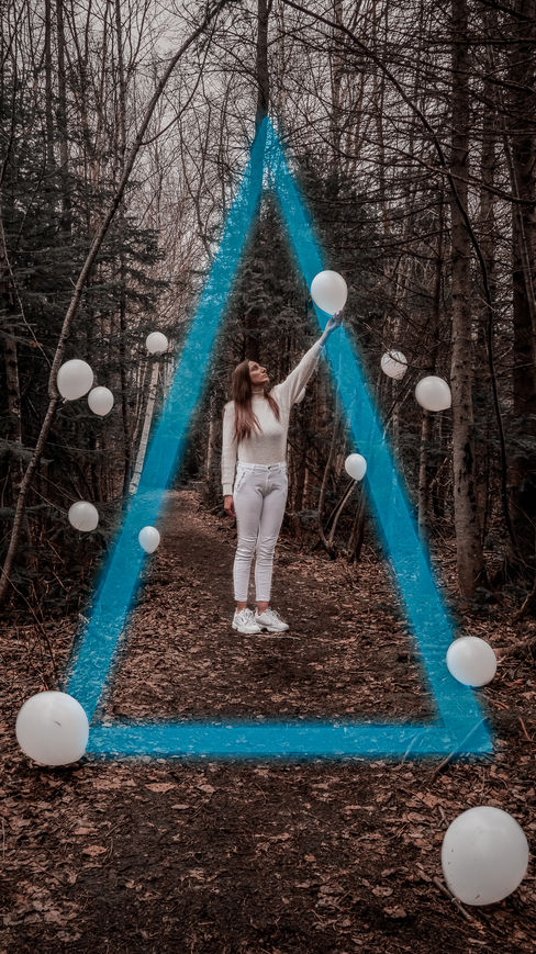 Cette seconde itération de la série photographique du sujet combine la couleur blanche, représentante de la pureté et de la transition du nouvel être qui évolue par trois couleurs différentes. Ces trois triangles de différentes couleurs symbolisent respectivement la destruction pour le rouge, le calme et la paix pour le bleu et la mort pour le gris. L’effet recherché pour cette série photographique est de vous permettre de ressentir une émotion différente grâce à la couleur sur le thème de la mort et du renouveau.